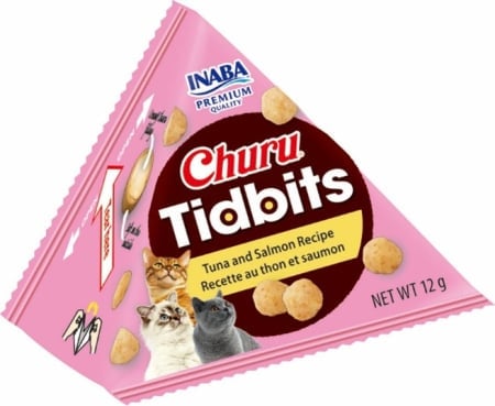 Churu Cat Tidbits Recompense pentru Pisici cu Ton si Somon 3 Buc – Rasfat fraged si cremos pentru pisici Rasfata-ti pisica cu o gustare irezistibila – moale la exterior si cu crema bogata de Churu in interior! Combinatia unica de texturi si ingrediente de calitate transforma fiecare bucatica intr-un moment delicios.