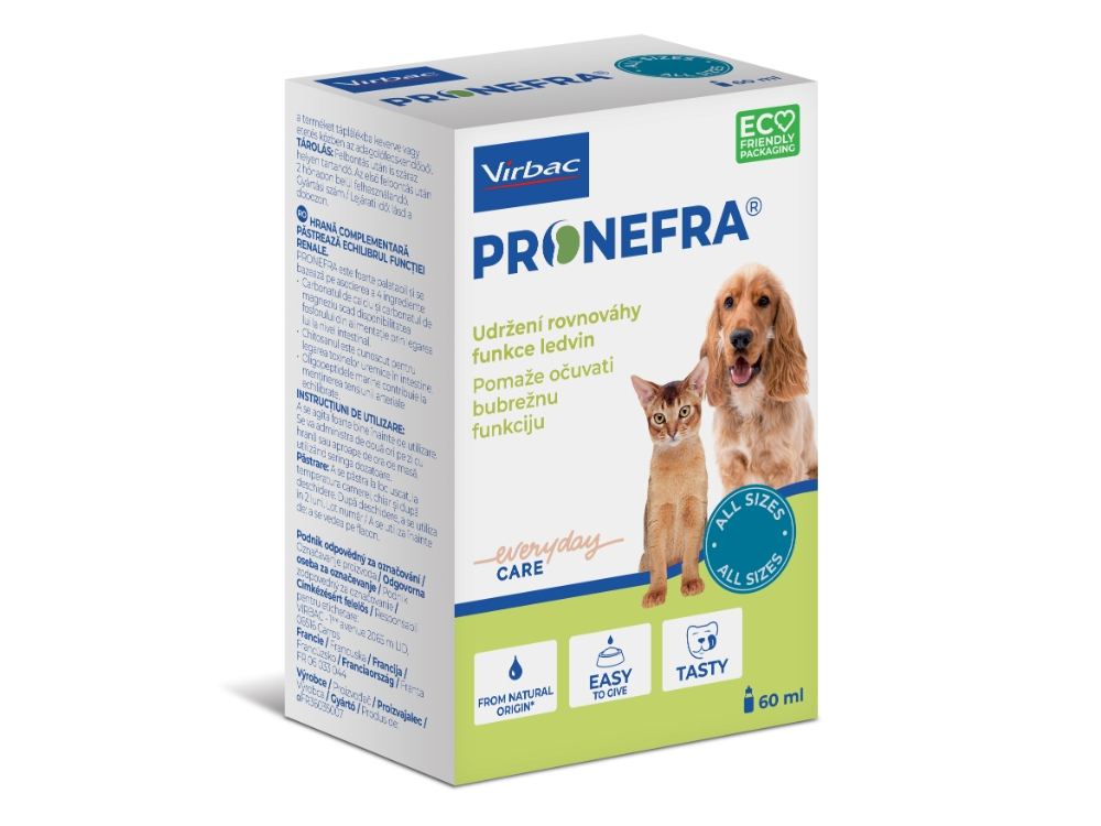 Pronefra este un supliment veterinar lichid destinat câinilor și pisicilor cu boală cronică renală (CKD). Formula sa unică combină 5 ingrediente active care ajută la reducerea simptomelor și progresiei insuficienței renale.