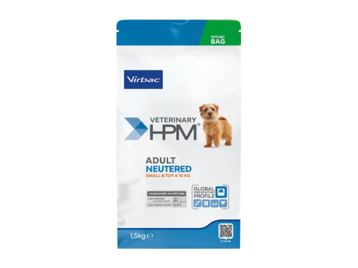 Virbac HPM Adult Neutered Dog Small & Toy este o hrană uscată superpremium, formulată special pentru câinii adulți sterilizați de talie mică și foarte mică (Toy).